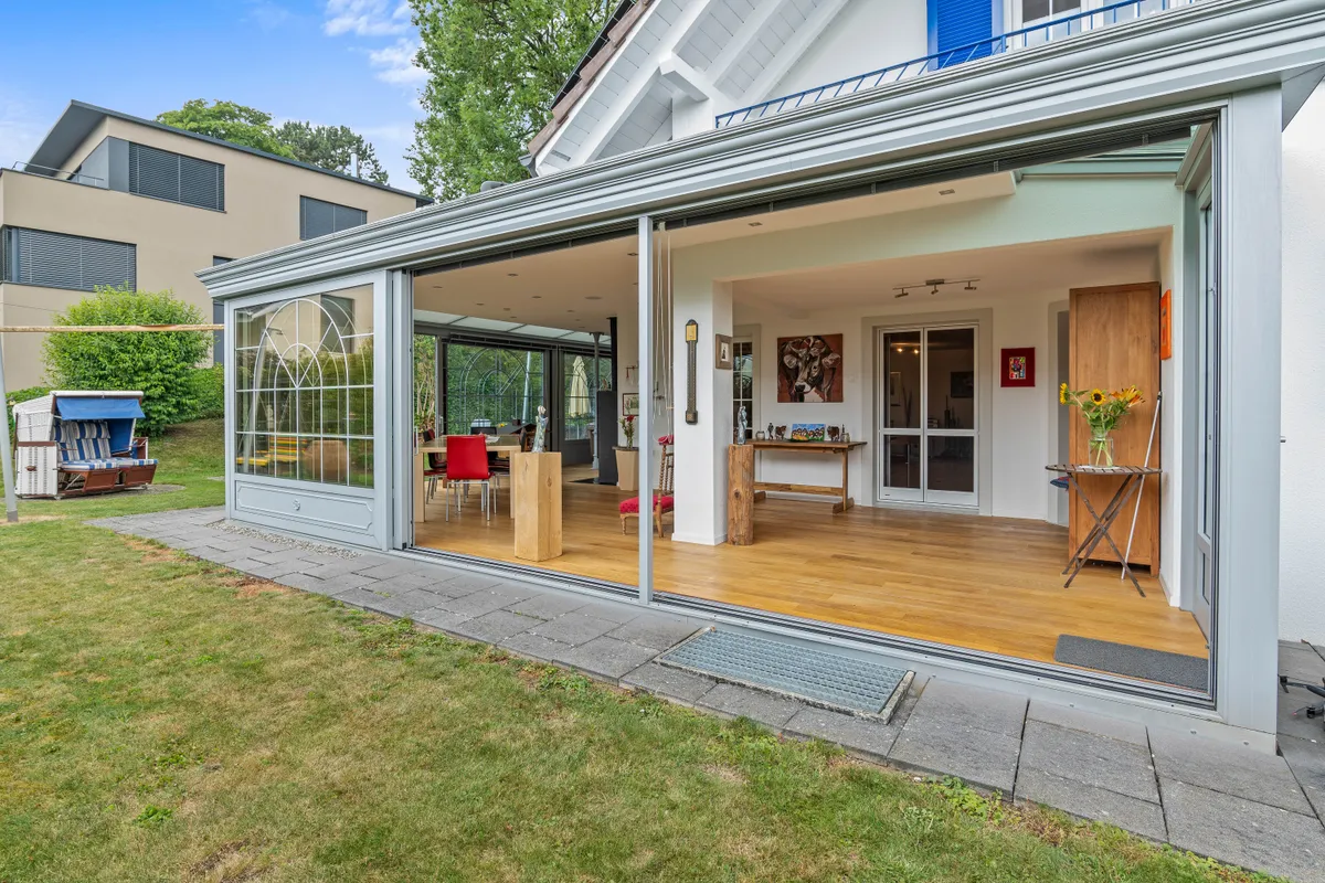 • gemütlich: Beheizter, verglaster Wintergarten mit 62m² bietet zudem zusätzlich im Aussenbereich viel Platz.